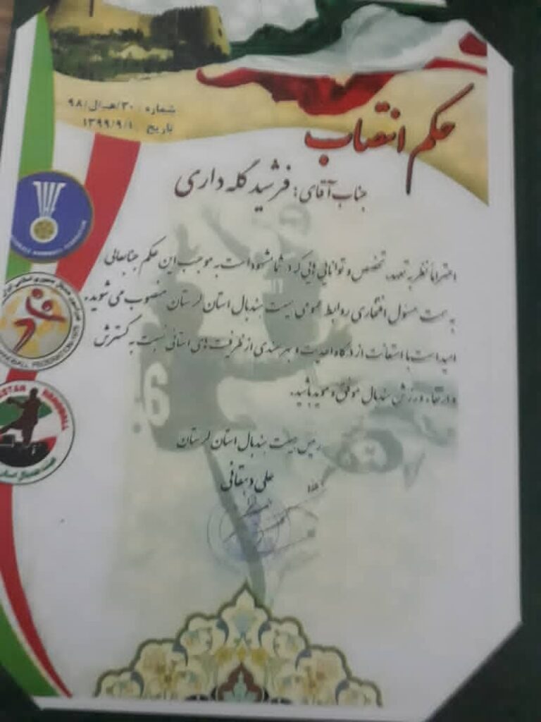✍درمورخ پنجم آذرماه سال ۱۳۹۹ طی حکمی از طرف علی دهقانی رئیس هیات هندبال لرستان و با حضور سعید احمدی رئیس هندبال شهرستان خرم آباد، عزت قنبر پور دبیر هیات لرستان وناصر رحمانی پیشکسوت و مربی هندبال لرستان جناب آقای فرشید گله داری به عنوان روابط عمومی هیات هندبال لرستان منصوب شد